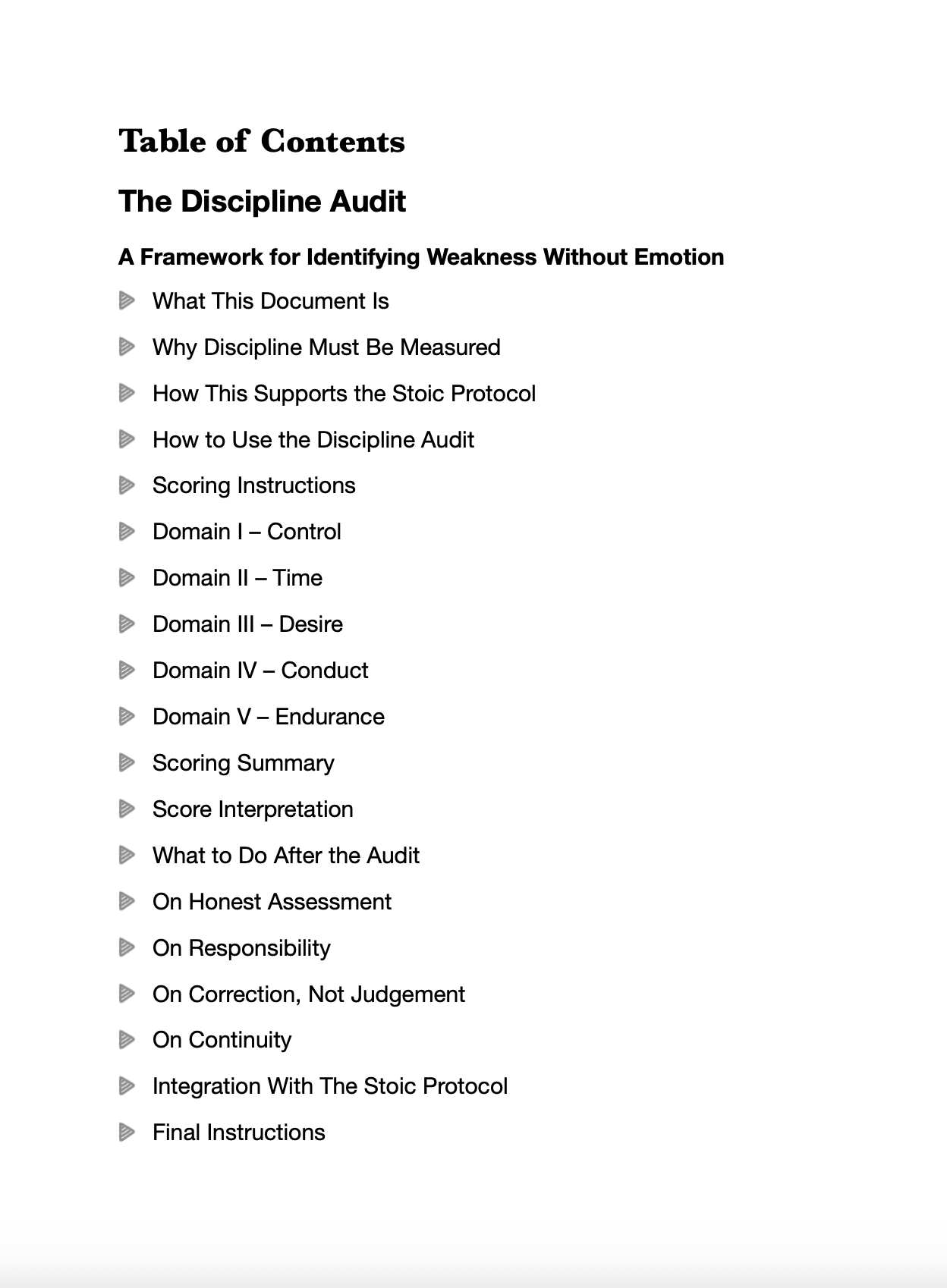 The Discipline Audit is a Stoic self-assessment tool designed to measure discipline with clarity, precision, and honesty.
