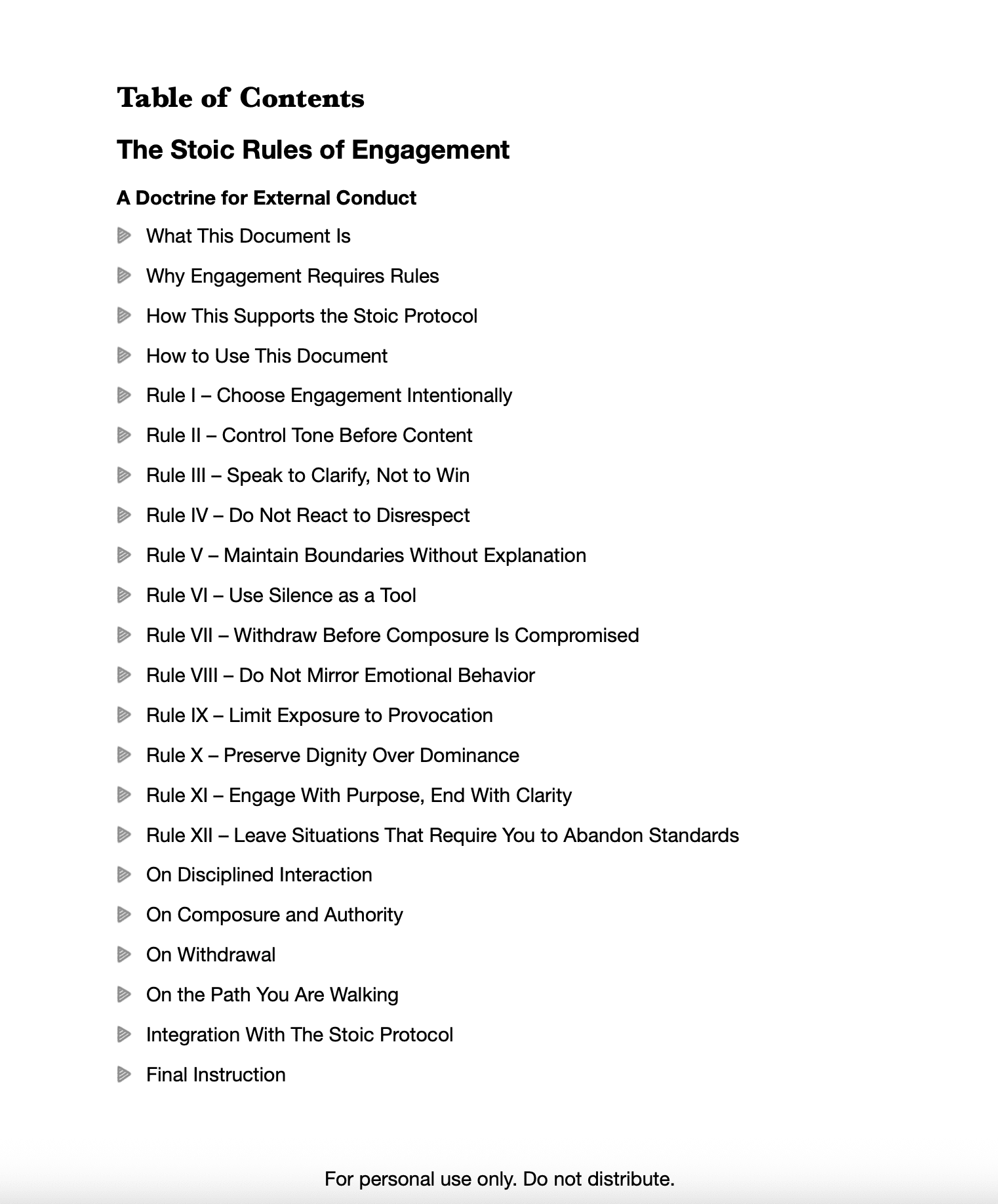 Inside are twelve rules designed to prevent emotional surrender during interaction. Each rule is expanded with practical guidance to ensure composure is preserved without escalation, explanation, or compromise of standards.